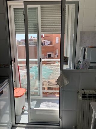 Mosquitera de aluminio para ventana con ruedas. Está en buen estado y la malla sin ningún tipo de rotura. Las medidas de la mosquitera son 108,5cm de alto y 72cm de ancho.