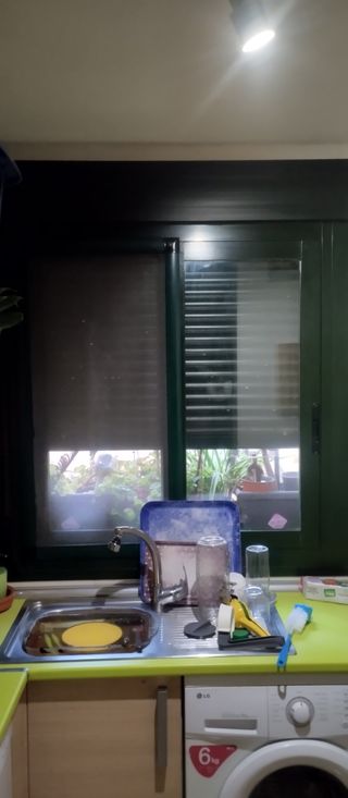 Ventana de aluminio con persiana enrollable. - Marco de aluminio. - Doble hoja corredera. - Persiana enrollable gris. Medidas: Altura 155cm hueco Ancho :154 cm hueco Ancho :8 cm