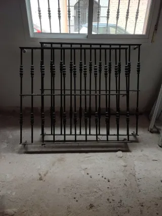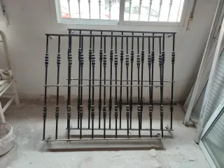 Conjunto de rejas de hierro forjado, ideales para ventanas. Su diseño clásico aporta un toque de elegancia. - Material: Hierro. - Diseño con barrotes verticales y detalles ornamentales. 4 rejas de 1x1,20 aprox. 40 euros x reja