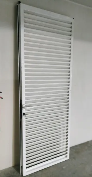 Puerta de hierro blanca con diseño de lamas horizontales. Ideal para exteriores o interiores Medidas 80 x 215 - Material: Hierro. - Color: Blanco. - Diseño: Lamas horizontales.