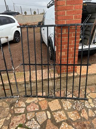 Puerta de hierro pintada en blanco, muy robusta. Medidas aprox. 95 cm de anchura × 110 cm de altura. Lleva cierre tipo pasador y herrajes/soporte (ver fotos). Ideal como verja, cierre de patio/jardín, separación de zona de trabajo, o para mascotas/niños (según instalación). Estado: usada, con marcas normales de uso/pintura (se ve en fotos), funciona bien. Entrega: preferible recogida en mano (es pesada/voluminosa). - Material: Hierro - Color: Blanco - Medidas: 95 x 110 cm