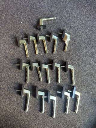 Lote de manillas para ventanas, ideales para reemplazar las antiguas o para proyectos de bricolaje. Son de un acabado plateado/dorado se venden 15 manillas de ventanas de ozilobatiente y puertas. son de aluminio para ventanas de pvc aluminio o madera. se venden todas juntas. no se separan. 15 cortas y una larga ver ultima foto igual tengo alguna más. se hacen envíos. - Acabado metálico plateado. - Base de plástico negro. - Diseño ergonómico.