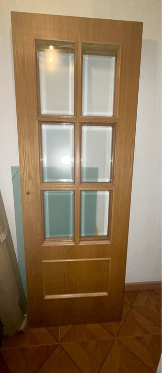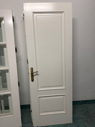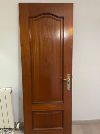 Puerta de madera con acabado natural con marcos y manetas incluidas. Todas las puertas están en perfecto estado. 8 puertas en total, se pueden vender por unidad también. Medidas: 1. Puerta comedor cristalera: 82.5 cm ancho- 202.5 cm alto- 3.5 cm grosor. Abertura izquierda. 2. Resto de puertas: 72.4 cm ancho - 203 cm largo - 3.5 grosor Abertura derecha 3 Abertura izquierda 4 - Material: Madera. - Color: Tono madera natural. - Precio por unidad. La de cristalera 35€. El resto 25€ - Entrega en febrero.