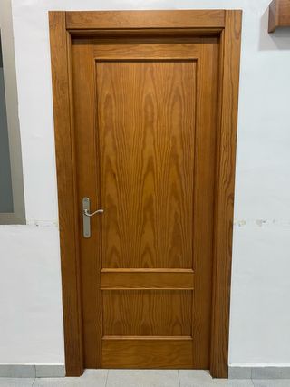 Puerta interior de madera con un acabado en tono miel. Su diseño clásico la hace versátil para diferentes estilos de hogar. - Medida: 80 cm de ancho x 2,03 alto - Material: Madera. - Jambeado de 9 cm - Se ofrece el marco de obra también, a larte de todo el jambeado. 60€ cada una.