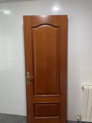Puerta de madera con acabado blindado. - Color: Madera natural. - Diseño: Clásico. - Herrajes: Incluye manilla y cerradura. El tamaño es 210x83cm La puerta se encuentra en aiguafreda. Precio algo negociable.