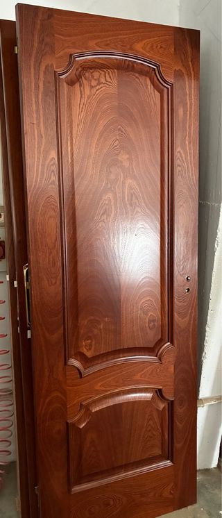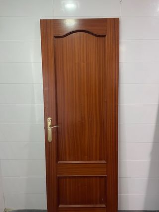 Puerta de madera en buen estado, con un diseño clásico y elegante. - Material: Madera - Color: Caoba - Acabado: Brillante - Incluye manilla dorada