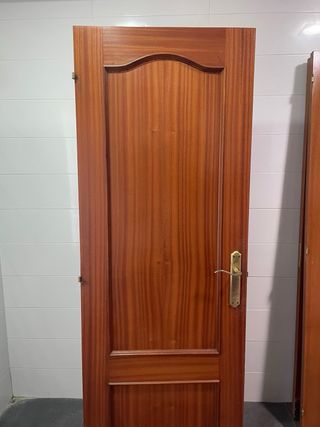 Se venden puertas macizas de madera, ideales para interiores. Cada puerta tiene un diseño clásico y elegante con detalles tallados. - Material: Madera maciza - Acabado: Barnizado en tono caoba - Diseño: Panelado con molduras curvas - Herrajes: Incluye manilla dorada y cerradura