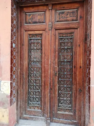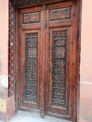 Puerta de entrada de madera estilo valenciano. Presenta un diseño robusto y clásico, con detalles ornamentales en metal.Para restataurar - Material: Madera. - Diseño: Valenciano. - Detalles: Rejas metálicas decorativas.