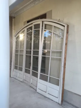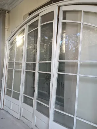 Conjunto de cristaleras antiguas de madera con un diseño clásico. - Marcos de madera blanca. - Paneles de cristal divididos por molduras.