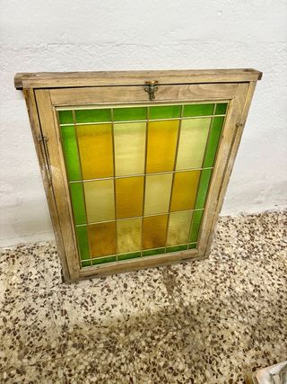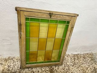 Ventana antigua de madera maciza con vidrio decorativo original en tonos verde y ámbar. Medidas: 80 x 100 cm Grosor marco: 7 cm Conserva herrajes originales y sistema abatible funcional con cadena lateral. Vidrio en perfecto estado, sin roturas ni grietas. Madera sólida y bien conservada. Ideal para decoración rústica, casa de campo, proyecto de restauración, puerta interior, cabecero o separación de ambientes. Pieza con mucho carácter y difícil de encontrar en este estado.