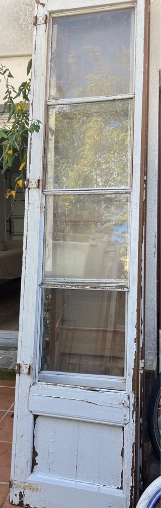 Puerta antigua de madera con paneles de cristal, ideal para proyectos de restauración. - Marco de madera pintado de blanco. - Paneles de vidrio. - Bisagras metálicas.