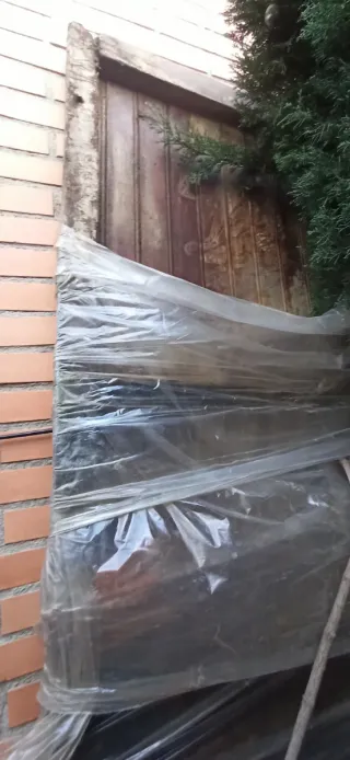 Portón grande de madera de mobila, procedente de derribo de una casa antigua. Ideal para proyectos de restauración o decoración rústica. 2 hojas, con cristal y cerradura. Está al aire libre, para restaurar. Precio negociable. Urge venta Medidas: 296'5cm de alto x 112 de ancho. - Material: Madera de mobila. - Estilo: Rústico / Antiguo.