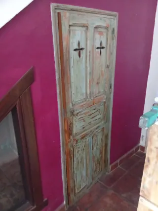 Puerta de paso antigua, ideal para proyectos de restauración o para dar un toque clásico a tu hogar. - Fabricada en madera. Tengo tres - Diseño de paneles. - Incluye manilla.