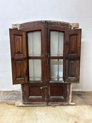 Conjunto de ventanas antiguas de madera. - Marco de madera. - Paneles de madera con - Cristales. Medidas 90cm de alto 70cm de ancho 60'4cm de interior con dos hojas de cristal y sus puertas de madera.tengo 2 iguales 20€ por unidad las 2 juntas 30€