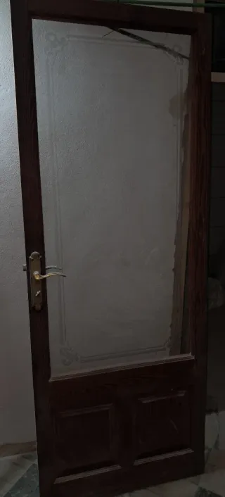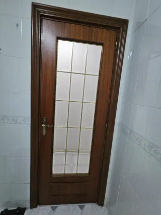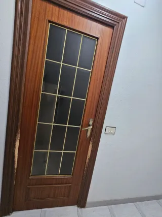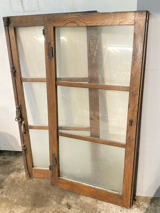 Conjunto de puertas de madera antiguas con detalles de cristal. Se negocia precio se tienen que desmontar - Marco de madera. - Paneles de cristal con diseño. - Tirador metálico.