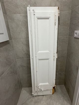 Es una puerta original de nuestra casa en un edificio de la primera década del siglo XX. Es de madera maciza, pesa muchísimo y vivimos en un tercero sin ascensor. Si te encargas de bajarla tú y llevártela es tuya por 20€ Puerta antigua de madera con un diseño clásico de seis paneles. - Estilo de seis paneles. - Acabado en color blanco. - Madera maciza