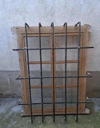 Ventana de madera muy antigua, con marco de madera con una magnifica reja de hierro forjado. Ventana: 1,47 alto/0.89 ancho Reja: 1,53 alto / 0.95 ancho - Marco de madera. - Reja de hierro con barrotes verticales y horizontales.
