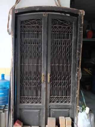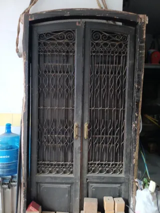 Conjunto de dos puertas de madera antiguas con detalles tallados y rejas metálicas. - Madera maciza. - Diseño clásico. - Rejas de hierro forjado.