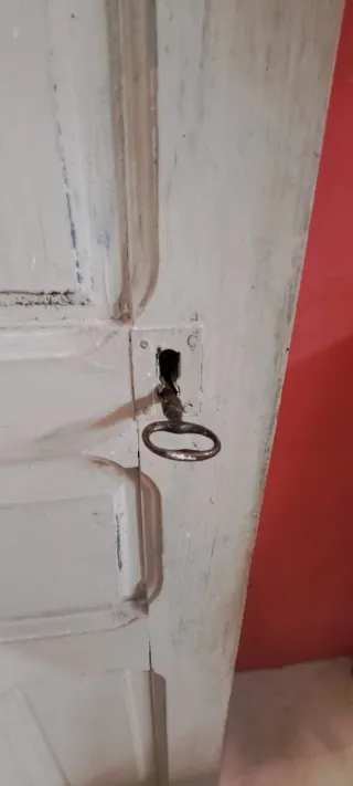 Puerta antigua de madera con diseño de paneles, conservando la cerradura original con su llave y cerrojo antiguo de hierro. Con apertura a derecha. No conservamos los marcos, pero tenemos otra igual con apertura a izquierda. Es pesada y está en perfecto estado. Ideal para volver a ser utilizada o darle otra funcionalidad. - Fabricada en madera maciza. - Estilo clásico con 6 paneles. - Detalles como cerradura con llave y cerrojo. - Mide 80 X 194 y tiene unos 4 cm de grosor. Hay posibilidad de porte o si quiere puede recoger en nuestra tienda de Colmenar de Oreja.