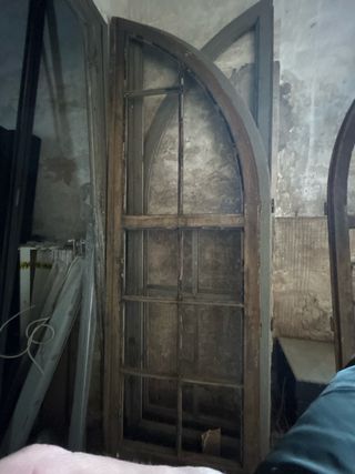 Conjunto de ventanas antiguas con un diseño que recuerda a las de una iglesia. Perfectas para proyectos de restauración o decoración. - Marco de madera. - Diseño arqueado superior. - Múltiples divisiones en el cristal.