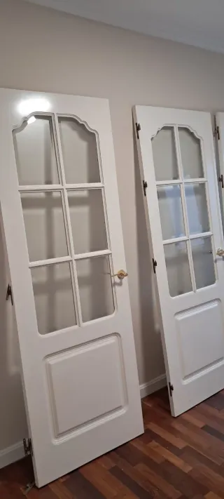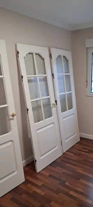 Todas son del mismo color aunque en las fotos parezcan diferentes. Las dos primeras son de 72cm. Las dos siguientes son de 62cm y la última mide 82cm, tiene cerradura y una ventanita encima para que entre luz y aire. Tengo otra puerta corredera de 72cm con tres cristales a juego con el resto de puertas. 300€ cada una negociables. El grosor de cada puerta es de 3'5cm