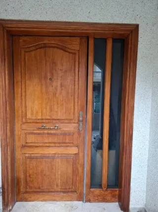 Puerta blindada de madera con acabado barnizado. - Diseño clásico con molduras. - Incluye cerradura y pomo. - Marco de madera a juego.