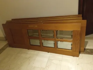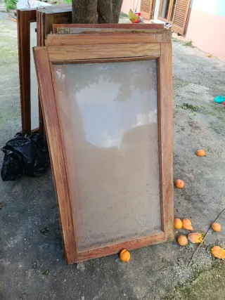 -3 ventanas de madera de 56,5cm ancho x 112cm alto cada hoja, para hueco de ventana de 112'5 ancho x 112 alto. Sin marcos. 20€ cada ventana. -Puerta con cristal de madera de 71,5cm ancho x 202cm alto. Sin marco. 10€