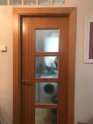 Puerta con cristal. Tiene manilla con pestillo. Con los dos marcos laterales y el de arriba. Medidas Ancho 61,5cm Alto 202,5cm Grosor 3,5cm