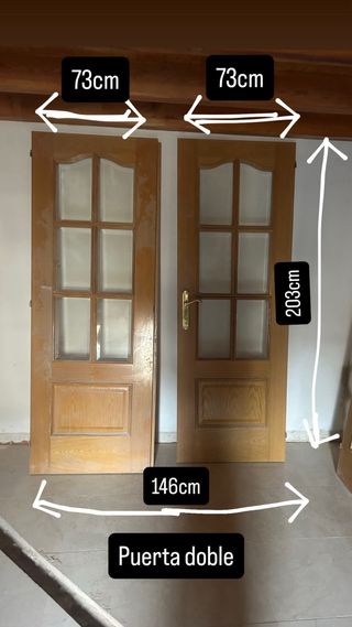 Puerta 1 ciega 62 ancho 203 alto Precio 50€ Puerta 2 Cristalera salón doble 82 + 43 ancho 203 alto Precio 75€ (Se venden juntas) Puerta 3 Cristalera individual 73 ancho 203 alto Precio 60€ Pack completo 170€ - Elaboradas en madera de roble maciza. - Una puerta es lisa y las otras dos con cristaleras. - Se encuentran en buen estado.