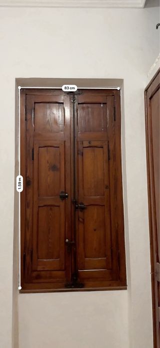 Se vende espectacular puerta doble de paso de estilo clásico, ideal para casas con techos altos o reformas que busquen piezas singulares y de calidad. • Material: Madera maciza de Mobila (Pino Tea), la madera noble más apreciada de la carpintería tradicional. • Medidas: 245 cm de alto por 128 cm de ancho total (las dos hojas y el marco). • Diseño: De dos hojas, con cuarterones y tallas artesanales (motivo de sol/estrella y fondo picado) en ambos paneles. Un diseño muy vistoso y con carácter. • Estado: Estructura muy sólida.