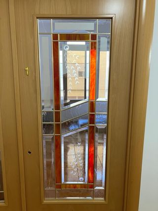 Vidriera decorativa para puerta de madera. Dos unidades - Diseño con cristales de colores y detalles grabados.
