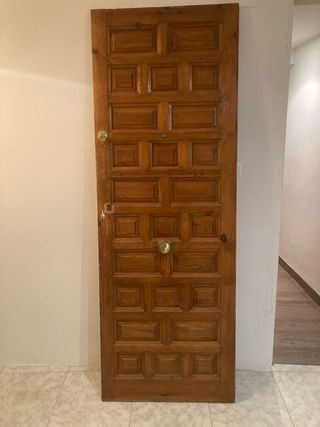 Precio negociable. Venta en persona. Puerta de madera de pino con un diseño clásico y elegante. Con un cerrojo nuevo y un anclaje a la pared para un segundo cierre. - Fabricada en pino. - Con pomo exterior. - Con mirilla. - Acabado en barniz.