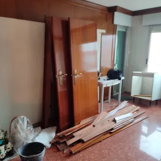 Lote de: - 4 puertas castellanas: 3 de 82cm y 1 de 72cm ancho. Alto: la estrecha 203, una 201 y dos de 202cm. 60€/unidad. - 5 puertas rechapadas embero.20€/unidad. - 1 puerta madera maciza con hueco para cristal de 72 cm de anchura y 207,5 de altura con pomo. 40€ - Pareja de puertas tipo vaivén con hueco para cristal 32cm de anchura cada una y 197cm de altura. 40€ - Molduras, aglomerados y restos de piezas de madera restos de una carpintería, de regalo con todo el lote o a convenir. Todas las puertas necesitan limpieza y retoques de barnizado, una de las puertas castellanas está sin barnizar. Todo 390€. Recoger pueblo zona Belchite.