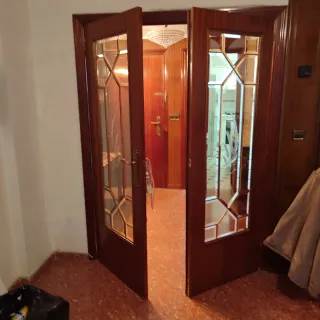 Elegante puerta doble de madera con paneles de cristal. Ideal para separar ambientes con estilo. Varios precios - Fabricada en madera de alta calidad. - Diseño con múltiples cristales. - Acabado natural salvo baños que son lacadas por interior 715x2020 cocina/ 720x2020 comedor 610xx2020 baños Salón doble 150 Pasillo y cocina con cristal 1 baño (color x dentro) 4 habitaciones Desde 75€ cada una