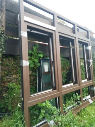 Conjunto de ventanales de PVC en color marrón. Listas para instalar. - Marcos de PVC resistentes. - Diseño moderno. -creo que nunca han estado puestos,observar cinta adhesiva de fábrica -faltan algunos cristales -600 eur cada uno -1000 los dos