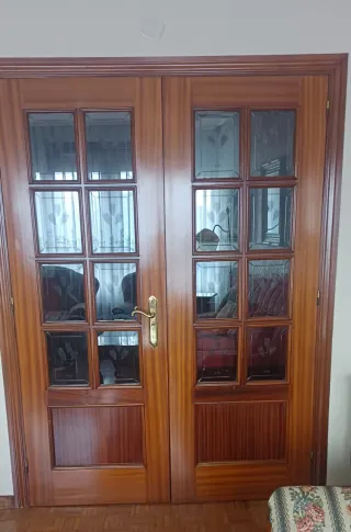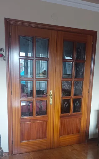 Conjunto de puertas de interior en sapelly para salón y cocina: - 1 puerta con cristal de 72 cm de ancho y 203 cm de alto. - 1 puerta doble con cristal de 72 cm de ancho cada hoja y 203 cm de alto. Desmontaje y transporte por parte del comprador. Las puertas están en un piso con ascensor en Avilés.