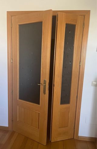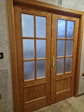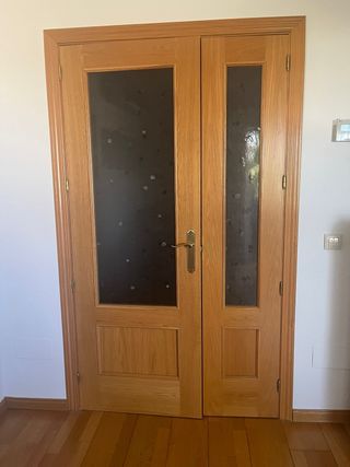 Se venden dos puertas de madera, ideales para salón y entrada.habitacion Ambas puertas tienen un diseño moderno con paneles de cristal translúcido. - Puerta doble de salón. - Puerta de entrada. - Paneles de cristal.