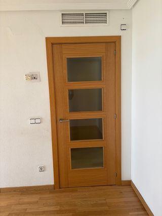 Vendo conjunto de puerta de interior y panel lateral a juego, fabricados en madera de roble de alta calidad. Diseño elegante con cristales traslúcidos en forma de arco, ideales para ganar luz natural manteniendo la privacidad. Material: Roble macizo (muy robusto). Estado: Buena conservación. Incluye: Manivela metálica moderna. Uso: Perfecta para salones, recibidores o pasillos. Medidas: ->Puerta: 70.5cm x 201cm x 3.5cm -> Fijo lateral: 31cm x 201cm x 3.5cm Precio algo negociable.