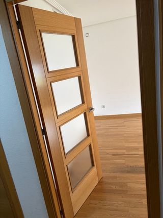 Elegante puerta doble para salón con diseño moderno y detalles en cristal. Ideal para separar ambientes con estilo. - Acabado en madera clara. - Paneles de cristal esmerilado. - Sin tirador. Sin marco. Solo las hojas Nueva cuesta más de 400€ tiene un pequeño desperfecto del transporte. Se ve en las fotos. Medidas 72x203 cada hoja. Escucho ofertas razonables.