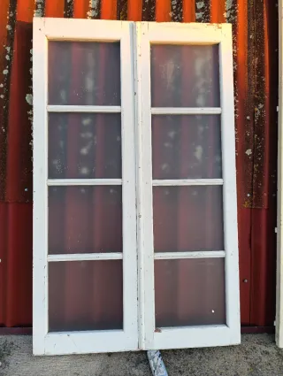 Vendo puerta doble de interior (ideal para salón o comedor) en color blanco lacado. Se entrega completa con su cerco (marco), tapajuntas y manivela Detalles: Diseño: Clásico con molduras y cristales traslúcidos que permiten el paso de la luz manteniendo la privacidad. Configuración: Hoja principal 70 cm+ hoja estrecha 42 cm (fijo abatible). Cristales impecables Medidas (incluyendo marco): 128 x 202 cm. completo para llegar e instalar.