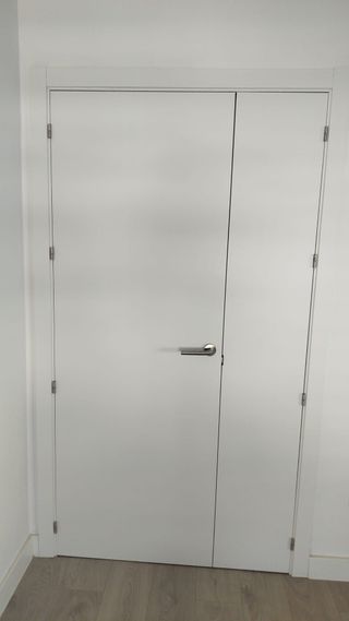 Puerta doble para salón con diseño moderno y elegante. - Acabado blanco. - Paneles de cristal esmerilado. - Tirador metálico. Medidas: hoja grande 72x203 hoja pequeña 42,5x203 Dispongo de otra puerta con cristal para cocina mismo modelo.