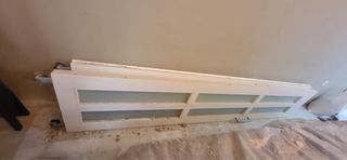 Puerta de salón de madera lacada en blanco. Diseño moderno con líneas horizontales. Abre hacia la izquierda - Material: Madera lacada. - Color: Blanco. - Diseño: Líneas horizontales. - Medidas: Puerta grande: 82 cm de ancho * 203 de alto Puerta corta: 43 cm de ancho * 203 cm alto - Para recoger en Colmenar Viejo Madrid