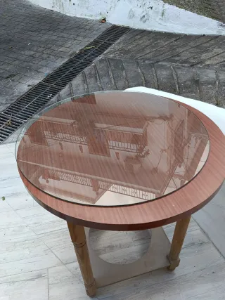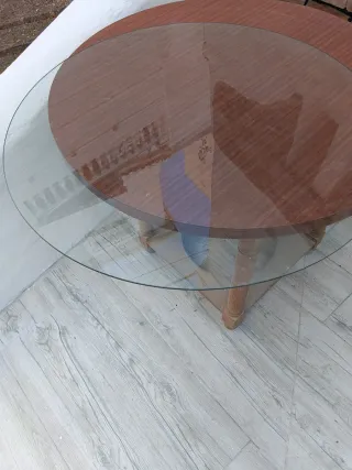 Mesa auxiliar con sobre de cristal y base de madera. Mesa 5€ (diámetro 70cm) Cristal 10€ ( diámetro 90cm)