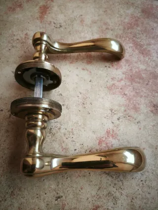 Conjunto de cinco manillas para puertas en acabado dorado con roseta redonda. Fabricadas en metal resistente. Precio por unidad 5€ cada manilla .