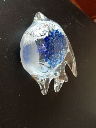 Preciosa escultura de pez hecha de cristal soplado. Tiene detalles en azul y blanco en su interior. Es una pieza única y llamativa. - Elaborada en cristal. - Diseño de pez. - Colores azul y blanco.
