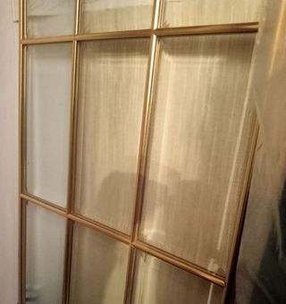Conjunto de vidrios para puertas con marco dorado. - Medida de alto 1,66 metros -Ancho 44 cm. - Diseño de paneles. - Marco metálico dorado. - Unidad 60 euros.