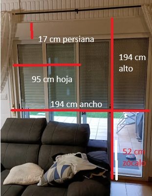Puerta corredera de aluminio con doble acristalamiento Climalit con persiana y mosquitera. - Marco de aluminio. - Doble cristal. - Medidas 218 alto x 196 cm ancho. - Mecanismo derecha. - Zócalo 52 cm de altura. - Cajón persiana incluido en la medida de altura, de 17 cm. - Cada hoja tiene unos 95 cm de anchura. - Un cierre, aunque funciona, sería mejor cambiarlo. - Asa interior, para facilitar apertura. Nota. Disponible al llegar las nuevas en octubre.