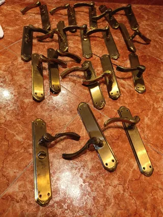 Conjunto de tiradores de puerta de latón con un diseño clásico y elegante. - Material: Latón. - Acabado: Dorado envejecido. - Diseño: Clásico con placa y manilla. - Cantidad: 15 unidades.