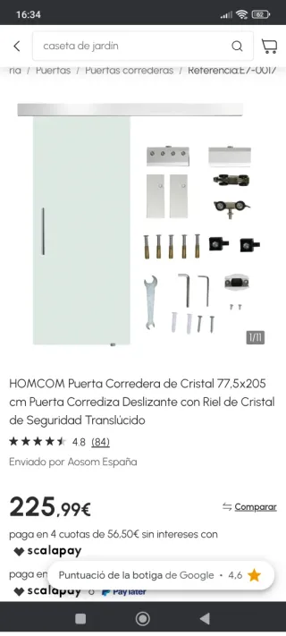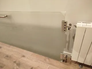 Puerta corredera de cristal translúcido con riel. - Medidas: 77,5x205 cm. - Material: Cristal de seguridad. - Incluye riel y accesorios de montaje. - Se encuentra en Vic. No la he llegado a montar, al final pondré una cortina.