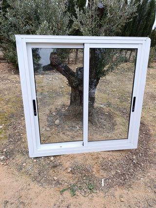 Ventana corredera de aluminio blanco. - Marco de aluminio blanco. - Tiradores negros. - Doble cristal climalit. Medidas: - 119 cm de alto - 118 cm de ancho
